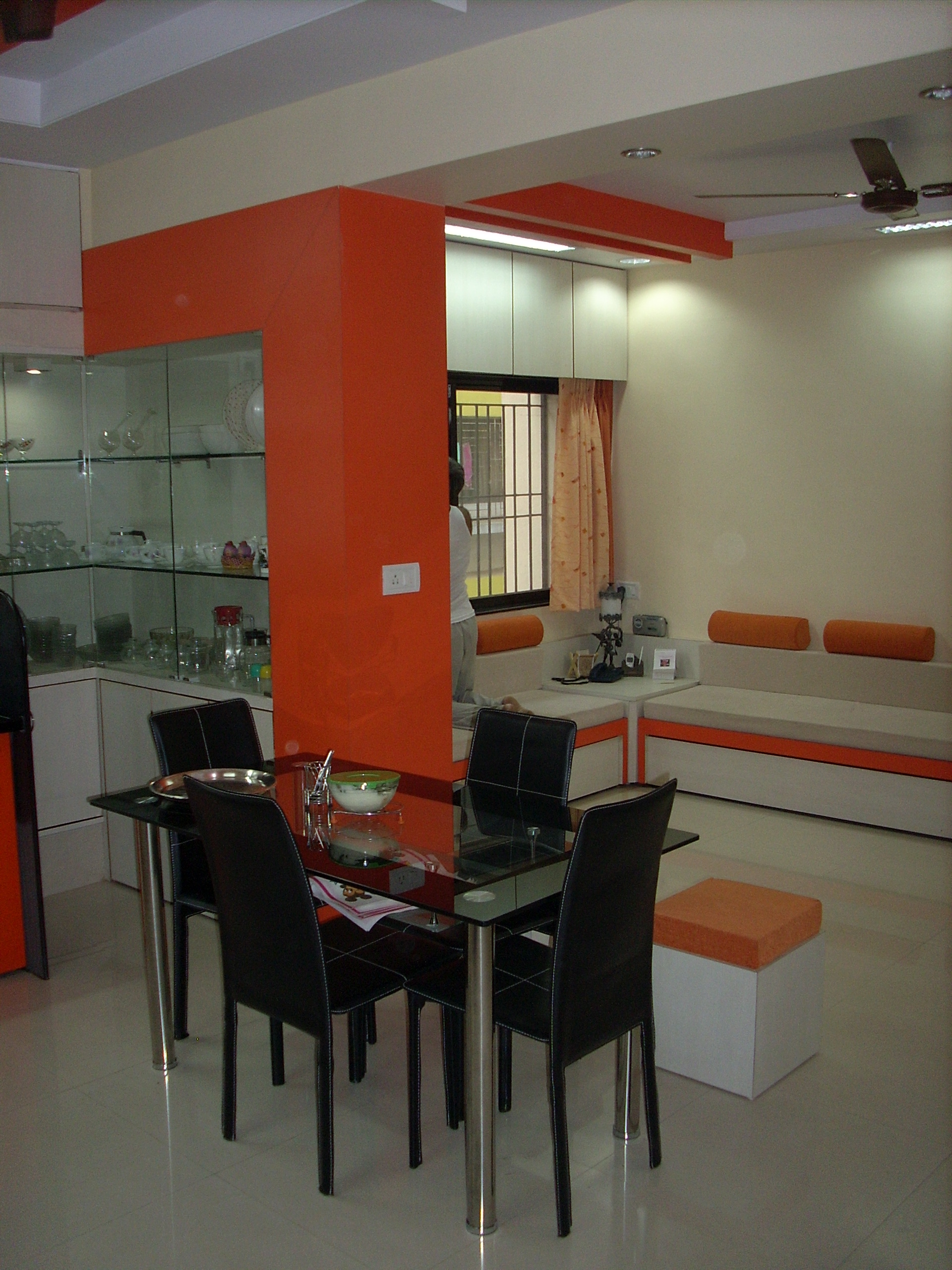• The owner wanted to change the feel of a small Apartment. The partition wall between Living & Kitchen was removed & the visual partition was created in the form of False Ceiling.